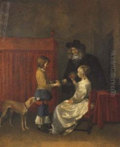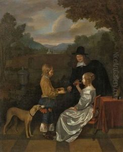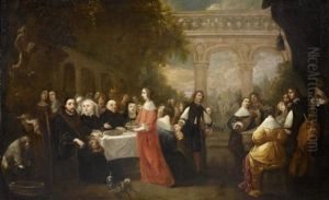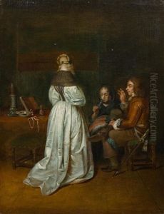An Interior With Two Gentlemen And A Lady Playing A Lute