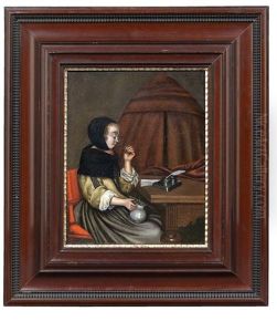 A Lady Seated In An Interior, With A Dog On A Partly Draped Table