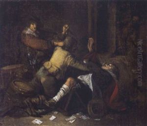 A Guardroom Interior With Four Figures Drinking And Playing Cards