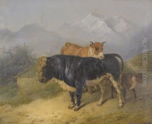 A Drover, His Livestock And Mounted Companion Travelling Along A Mountain Path On Which A Horsedrawn Waggon Ascends
