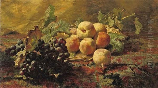 Blue Grapes And Peaches In A Wicker Basket