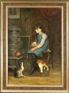 Stimmungsvolles Genrestuck Mit Einem Jungen Madchen Am Ofen, Zwei Katzen Futternd