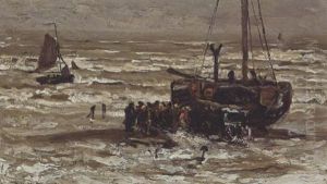 Bomschuiten With Fishermen In The Breakers, Katwijk