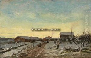 A Winter Scene With A Figure Walking Along A Path