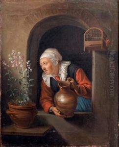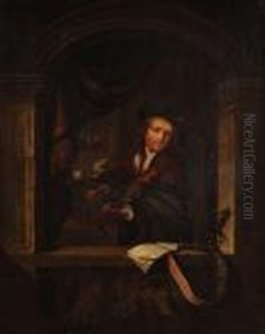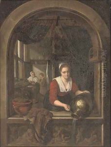 A Young Woman At A Window With A Parrot And Birdcage