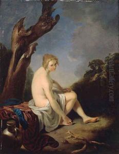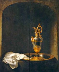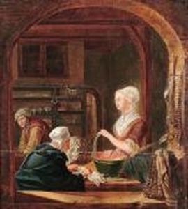 Interior, A Woman Saying Grace Before Eating, Spinning Wheel, Pots,basket And A Sleeping Dog, An Open Window To The Left