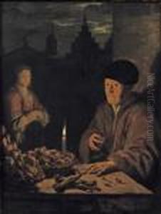 Zwei Manner In Nachtlichem Interieur Beim Schein Einer Ollampe