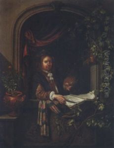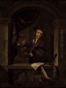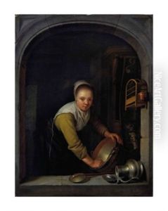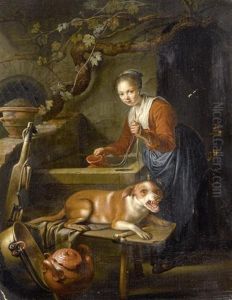 A Young Girl At A Window Ledge With A Cat And A Mouse-trap, A Hung Duck And A Pewter Ewer Beside Her