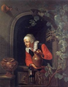A Woman Leaning Out Of A Window With A Basket On Her Arm, Picking Grapes