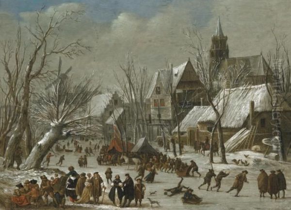 A Winter Landscape With Figures On A Frozen Canal