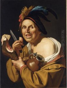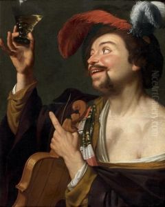 A Laughing Violinist, Half-length, Wearing A Blue And Yellow Striped Doublet And A Plumed Cap, With A Violin Tucked Under His Arm