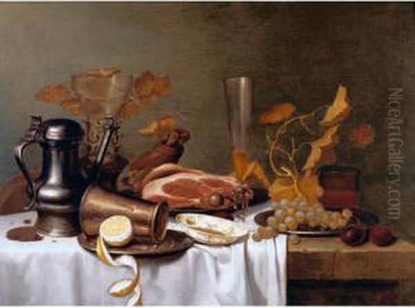 Still Life With A Haunch Of Ham, A Lemon And Grapes On Pewter Plates, Together With A Roemer, A Pewter Jug, Plums And Glasses