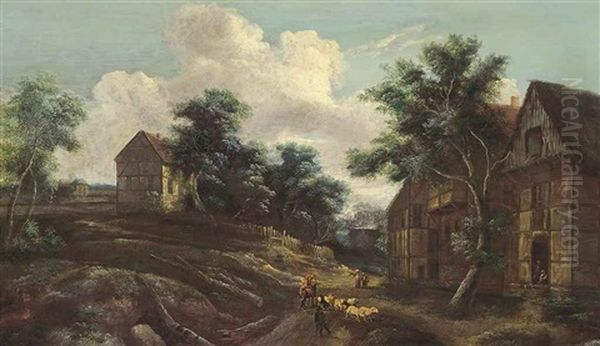 A Shepherd With His Flock And Other Figures On A Path By A Village