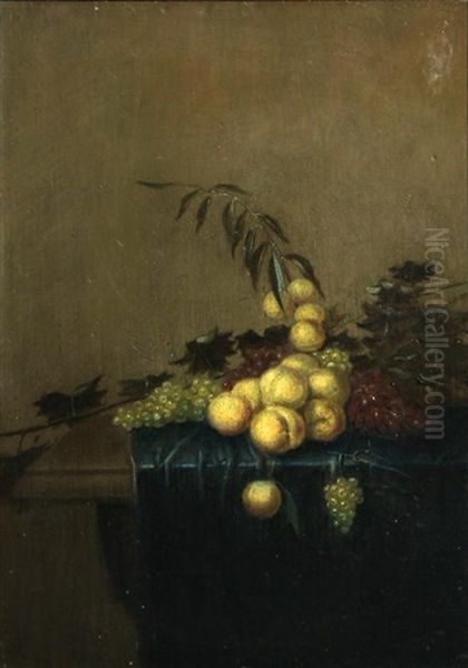 A Still Life Of Grapes And Peaches Resting On A Table Draped With A Blue Cloth