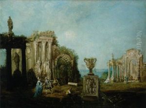 Capriccio Architettonico Di Rovine Antiche, Con Una Porta Diroccatadi Ordine Corinzio Ornata Da Vari Rilievi Marmorei, Presso Unacosta Mediterranea Con Astanti In Costumi Galanti Ed Un Velieroalla Fonda