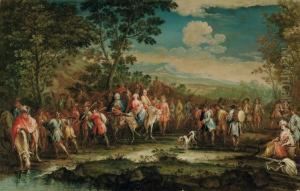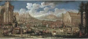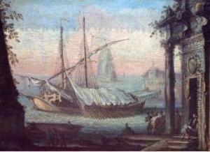 A Coastal Landscape With Elegant Figures Before Ruins (+ A Coastal Town With Figures On A Quay, Shipping Beyond; Pair)