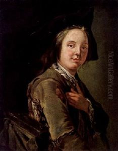 Portrait Of The Artist Seated At His Easel In A Ripped Blue Jacket And White Shirt, With His Palette And Brushes