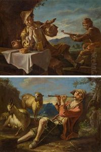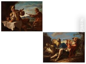 Flotenspielender Hirte Im Gras Neben Ziege Und Schaf (+ Junger Mann Am Tisch Mit Brot, Kase Und Meerschaumpfeife, Daneben Ein Mandolinenspieler; Pair)