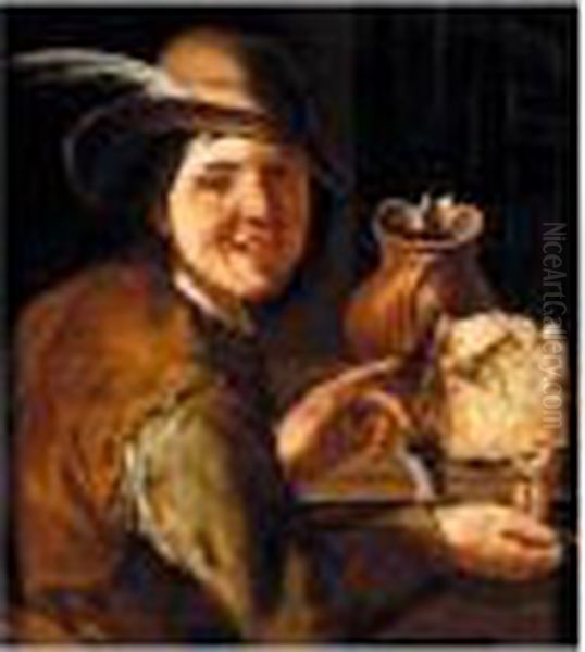 A Merry Smoker At A Table With A Large Cheese And An Earthenware Jug