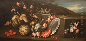Still Life With Pomegranites, Cherries, A Blue And White Bowl Of Currants, Other Fruit, Funghi And Flowers