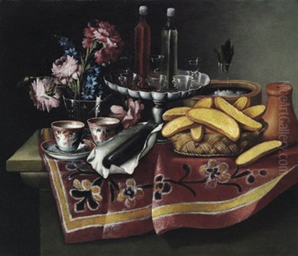Natura Morta Con Fiori, Alzata Con Vetri E Liquori, Ghiacciaia, Ceramiche E Cesto Con Pane