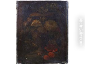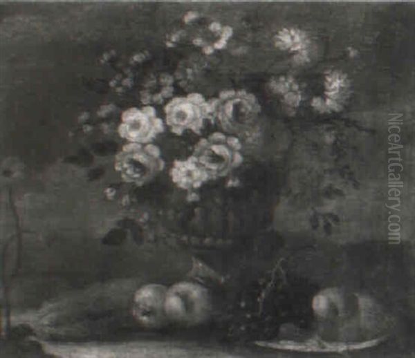 Flowers In A Sculpted Urn With Fruit On A Plate In A Landscape