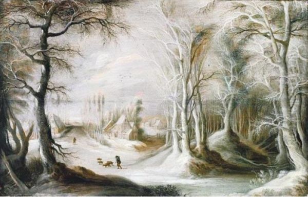A Winter Landscape With A Peasant Walking Through Snow, A Small Village In The Background