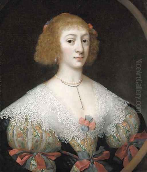 Portrait of a lady, half-length, in an embroidered dress with an ornate lace collar, feigned oval
