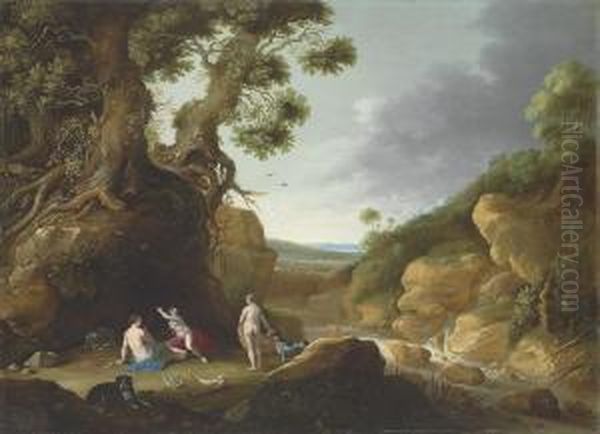 Diana And Her Nymphs In An Extensive, Wooded River Landscape