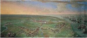 A Coastal Landscape With A Three-master At Anchor, Figures Conversing In The Foreground And A Town Beyond
