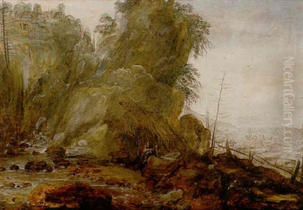 A Mountainous Landscape With A Hermit Reading Beside A River, A Hill Top Town Above