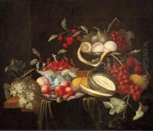 A Still Life With Strawberries, Pears And Cherries In Porcelainbowls, Together With A Bun On A Silver Plate, A Roemer, A Tazza, Ajug, Two Pipes And Burning Taper, All On A Table Draped With Awhite Cloth