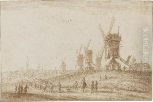 Travelers On A Road By Windmills And A Distant View Of Antwerp