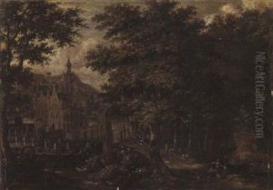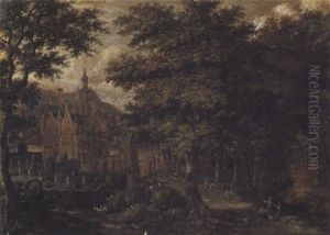 Wooded Autumnal Landscape With Figures And A Distant Townscape