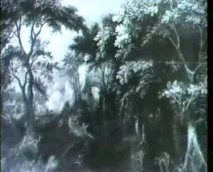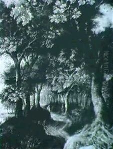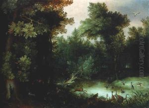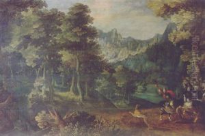 Extensive Wooded Landscape With Hunters And A Village Beyond