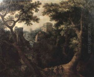 A Landscape With A Huntsman And Other Figures In An Avenue, A River Valley With A Castle And A Hamlet And Mountains