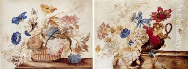 A Basket Of Poppies, Peonies, Tulips, Roses And Carnations With A Butterfly On A Ledge