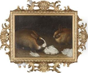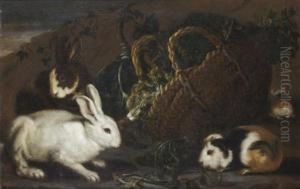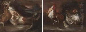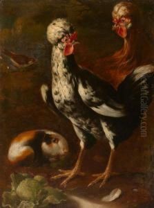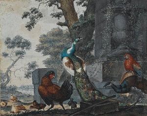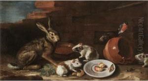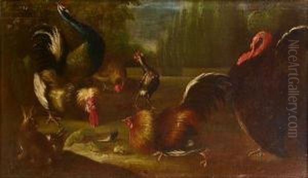 A Turkey, Peacock And Cockerels With A Rabbit In A Landscape