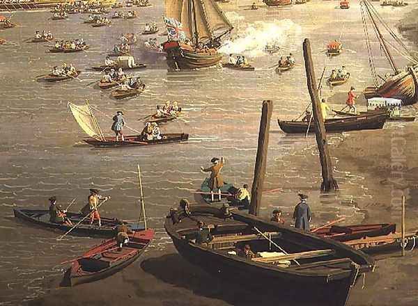 The River Thames with St. Paul's Cathedral on Lord Mayor's Day, detail of boats by the shore, c.1747-48