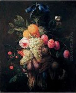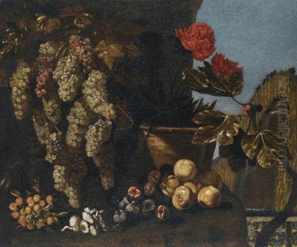 Still Life With Hanging Grapes On The Vine, Figs And Fungi In A Garden Setting