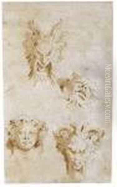 A Sheet Of Four Head Studies: Three Satyrs And Bacchus