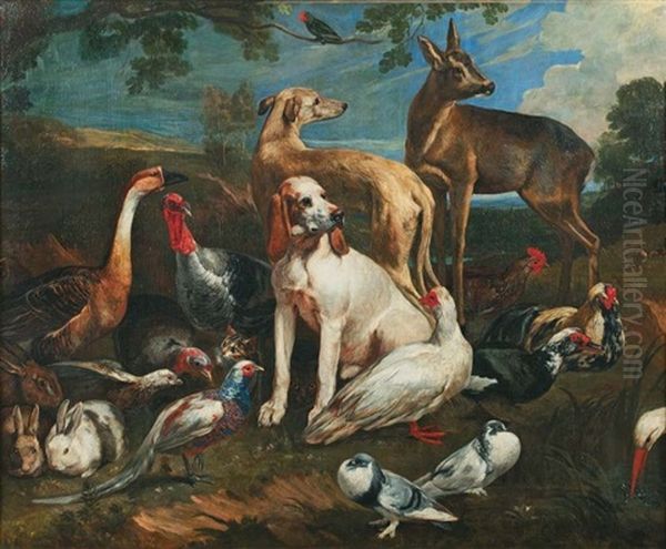 Chien Et Chevreuil Entoures D'animaux De Basse-cour