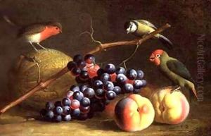 Still life of fruit on a ledge with Parakeets
