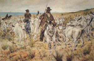 Two mounted with shepherds herd bull