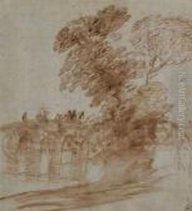 A Landscape With A Tree And Two Travellers Near A Pond In The Foreground, And Distant Buildings Behind