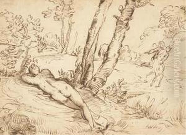 Une Femme Endormie Dans Un Paysage Avec Un Satyre Enlevant Unefemme