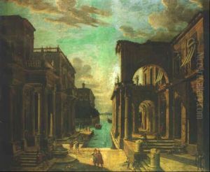 A Capriccio Landscape With Classical Ruins And Figures Crossing A River In The Foreground