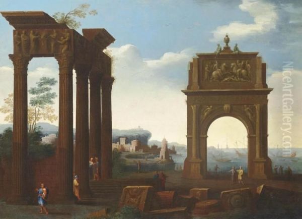 An Architectural Capriccio With Figures Among Classical Ruins, A Harbour Beyond