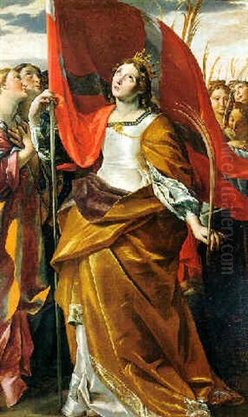Saint Ursula Holding A Banner And A Palm Branch Looking Toward Heaven With Her Accompanying Virgins Holding Their Branches Of Martyrdom