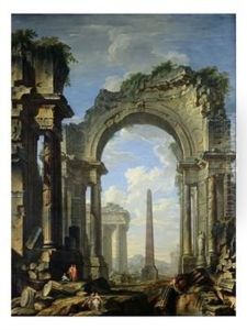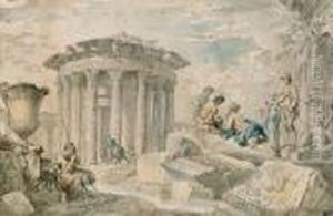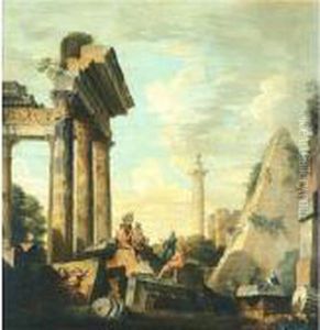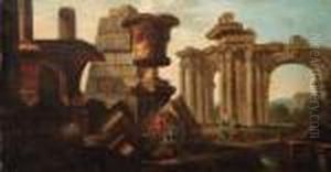 A Capriccio Of A Ruined Ionic Temple And An Obelisk With Figures